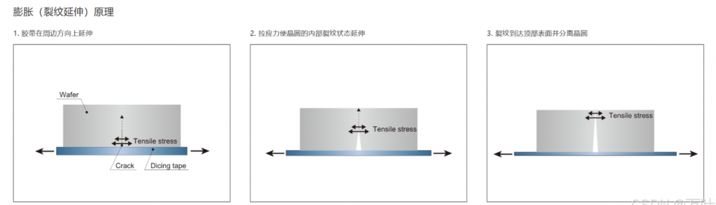 通過膠帶膨脹等行為在周邊方向上拉緊膠帶,對(duì)已形成 SD 層的晶圓施加外力。這會(huì)對(duì)晶圓的內(nèi)部裂紋狀態(tài)施加拉應(yīng)力,并使裂紋延伸到頂部和底部表面,從而分離晶片。由于晶圓分離是通過延伸裂紋進(jìn)行的,因此沒有應(yīng)力施加在器件上。此外,由于基本上沒有截口損失,這會(huì)提高芯片成品率。